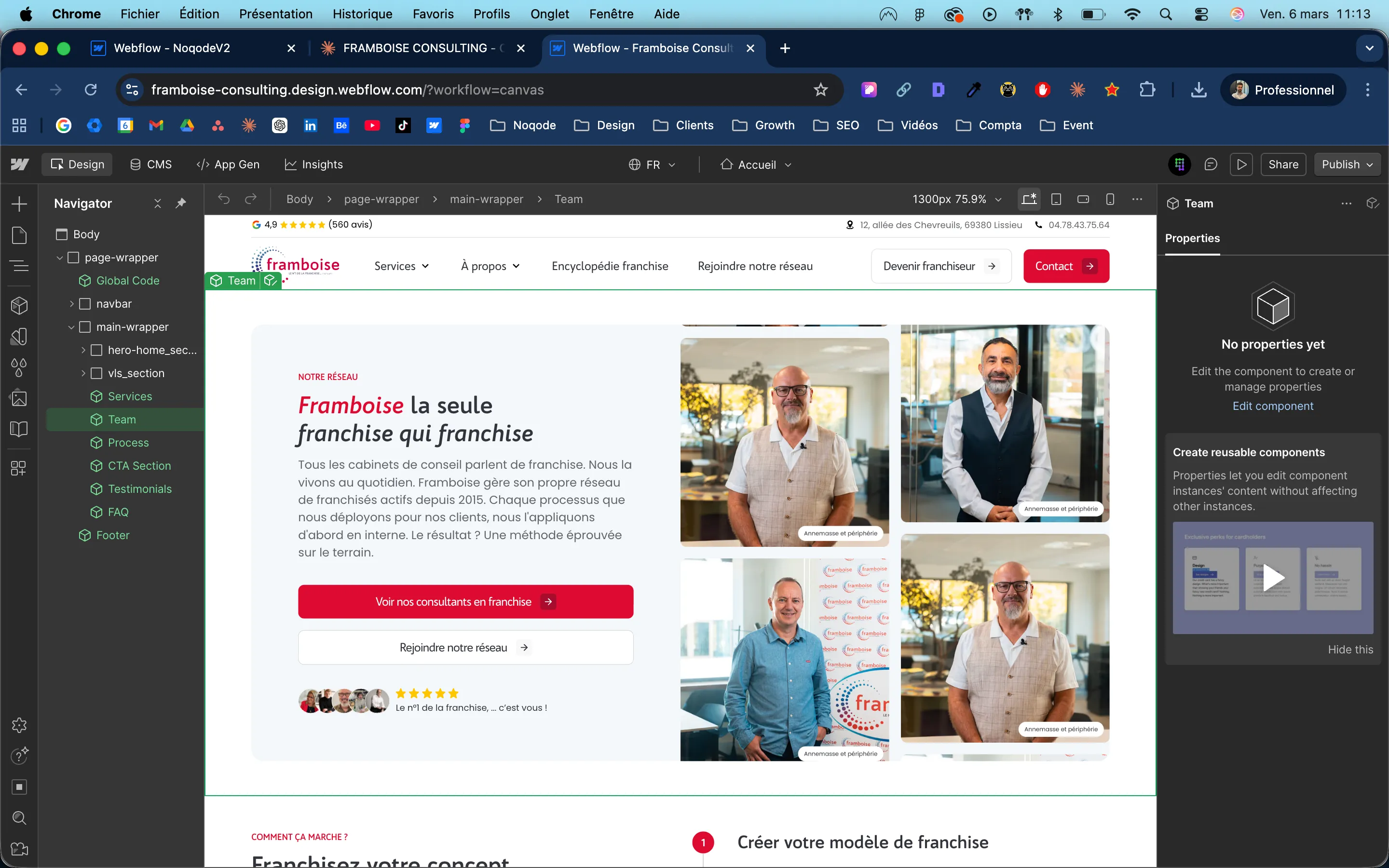 The Webflow structure was designed around reusable components guaranteeing visual coherence and technical maintainability: Team section with head office team photos, Services block with icons and descriptions, CTA component with action buttons, footer with legal links and social proof (Google 4.9/5, +560 reviews).