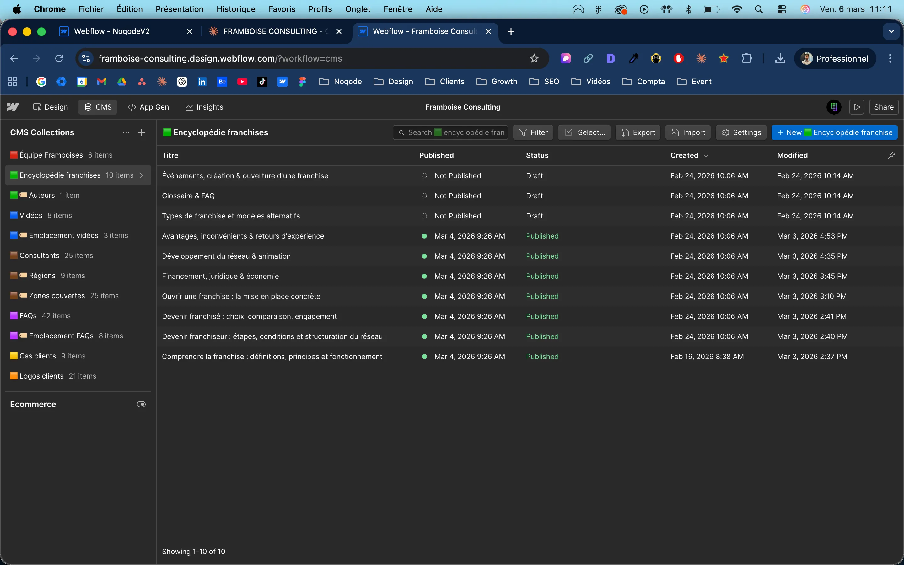 Then, structure a Webflow CMS ecosystem offering total autonomy on the encyclopedia and the planned sheets, the consultant profiles (33 harmonized profiles), the customer cases (franchisor testimonies), the FAQ (42 questions spread over 6 locations) and the service pages. The central objective was to free Framboise from any technical dependency and to drastically accelerate the production of strategic content.