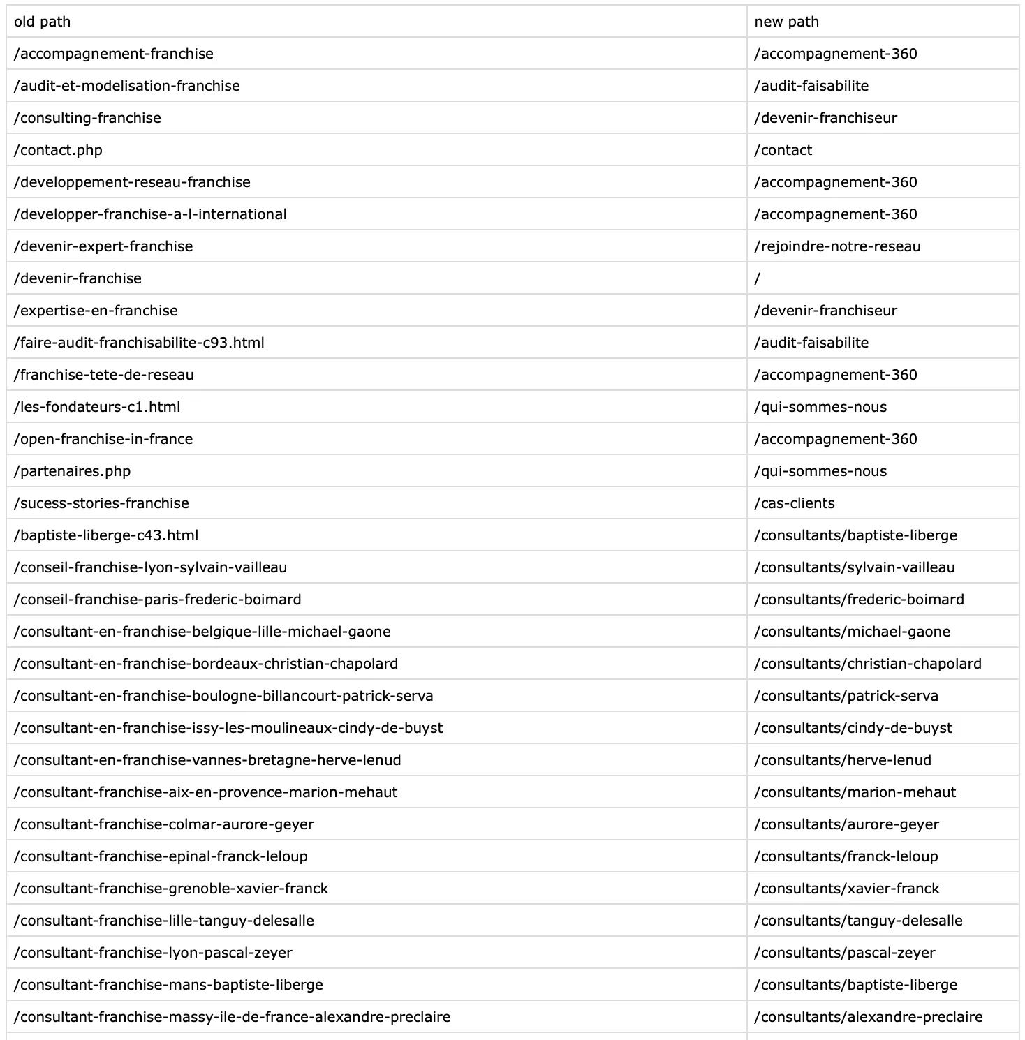 La migration SEO propre avec 65 redirections 301 mappées garantit zéro perte de visibilité historique. Toutes URLs performantes (/, /devenir-franchiseur, /creer-une-franchise, /developpement-reseau-franchise) sont préservées ou redirigées correctement vers leur équivalent structurel. L'autorité domaine construite depuis 2015 est intégralement transférée au nouveau site, préservant des années d'investissement SEO.
